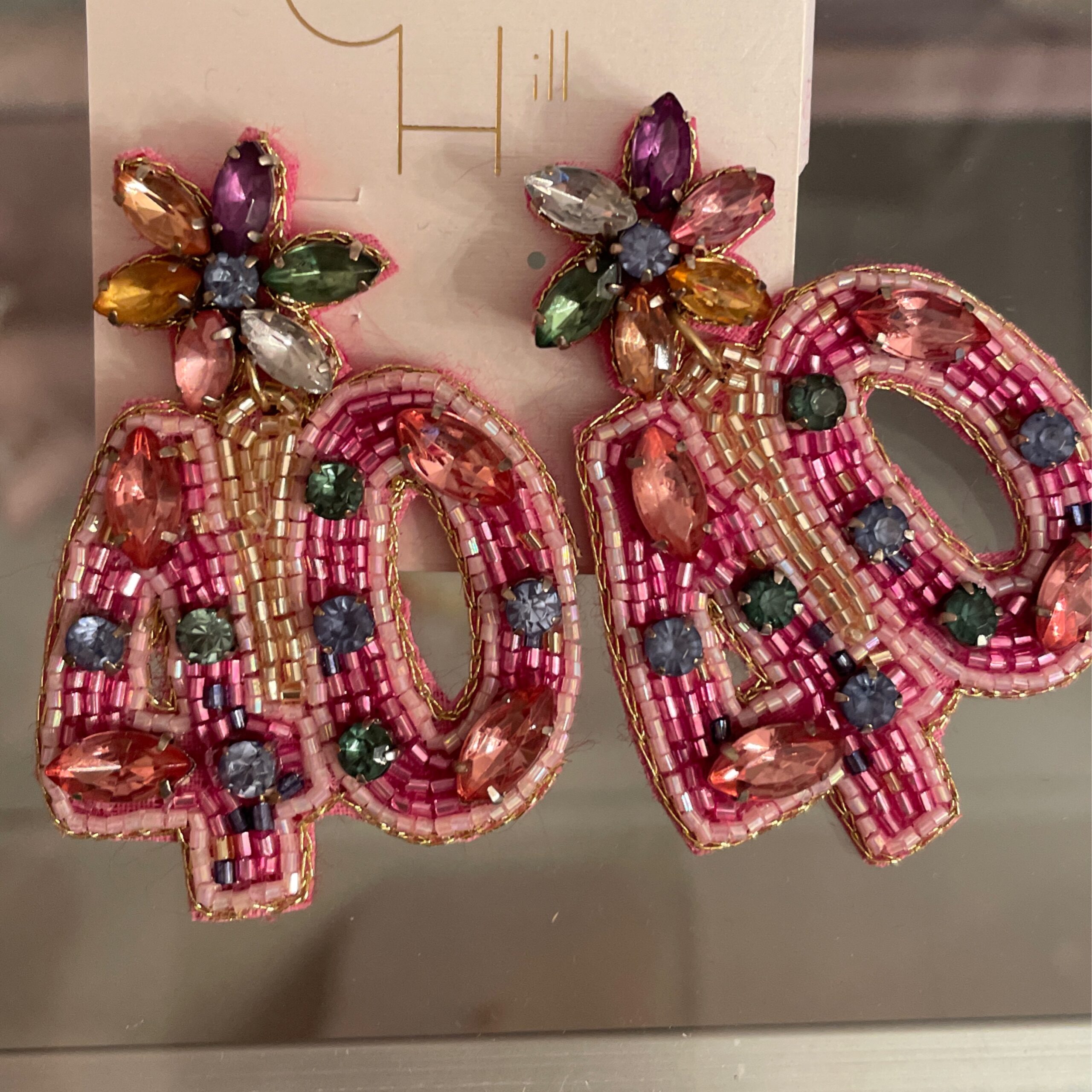 It has pink beading and multicolored gemstones on a post back.